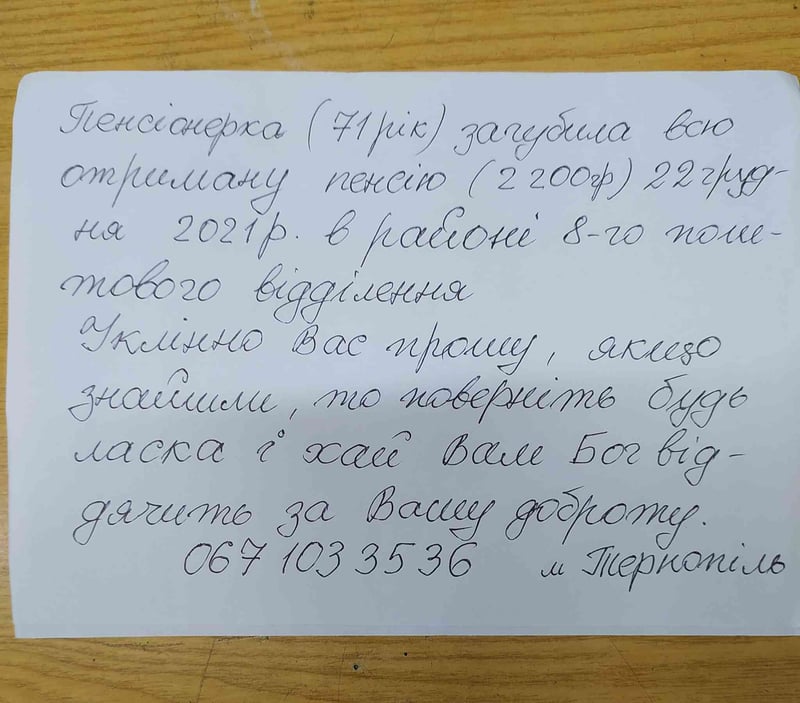 У Тернополі пенсіонерка загубила 2200 гривень пенсії та у фейсбуці у спільноті «Загубив-знайшов Тернопіль» попросила, якщо хтось знайде гроші, повернути їх.