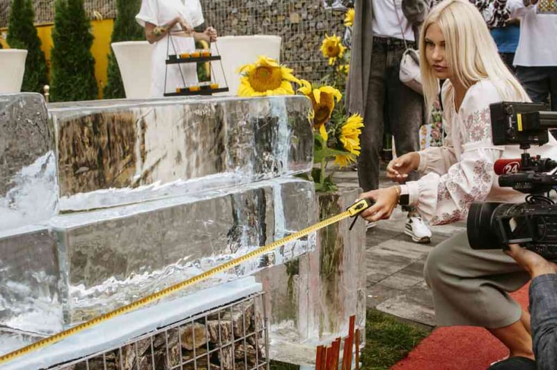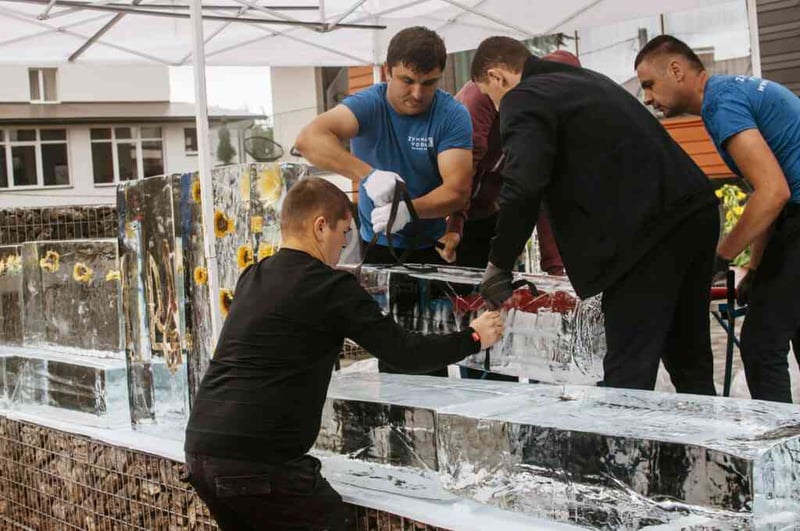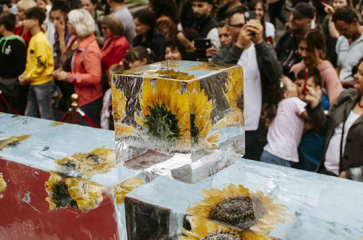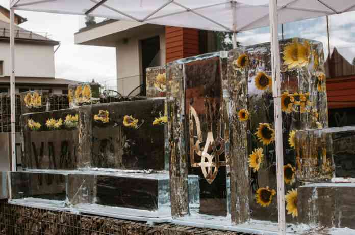 У льодових брилах, кожна вагою понад 100 кг, були заморожені соняшники та зображення національного герба України – Тризуба.