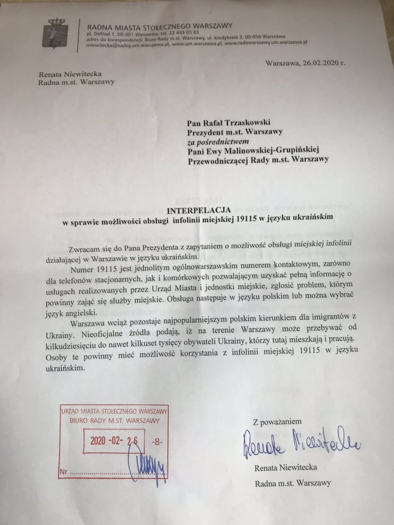 Інфолінія міської довідкової служби столиці Польщі – Варшави – може обслуговувати громадян також і українською мовою.