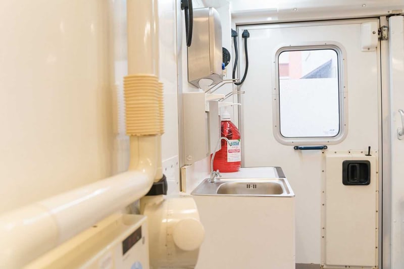Всередині «швидкої» вмонтували стоматологічне обладнання. Зокрема автомобіль обладнаний LED-світильником зі зміною кольору й температури світла, умивальником ємністю 100 літрів.