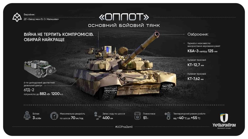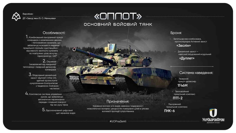 За інформацією, БМ «Оплот» – це середній танк українського виробництва. Бойову машину виготовляють на Заводі імені В.О. Малишева.