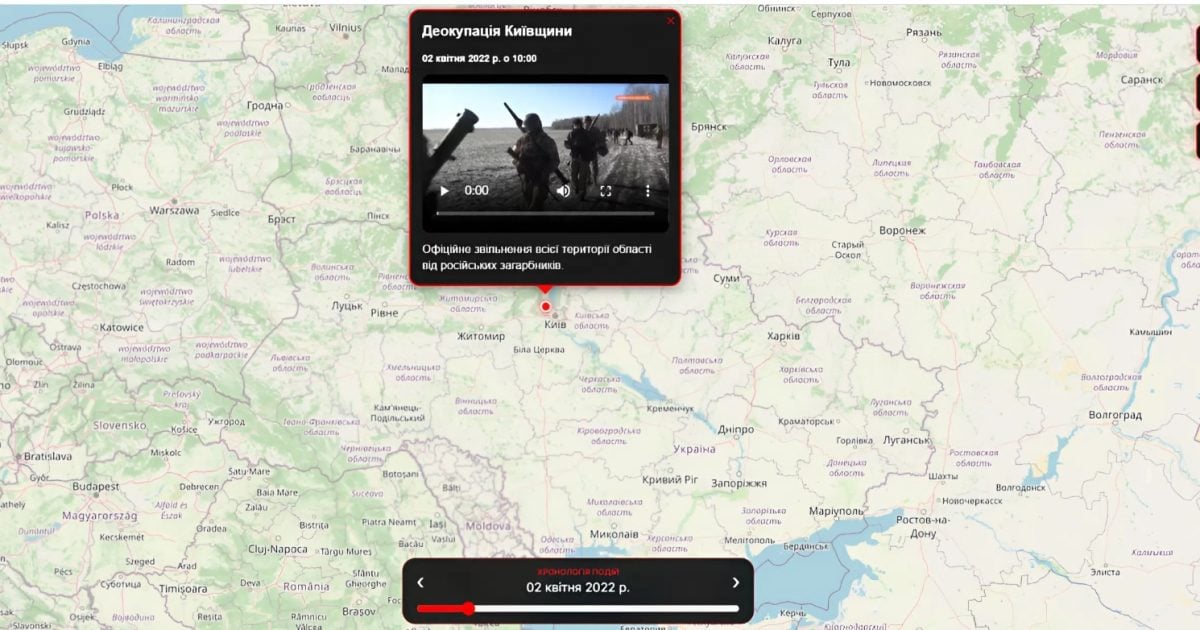 Хронологія, позначена на мапі, починається з 24 лютого 2022 року. Коли ви обираєте дату, на мапі з’являються червоні позначки, які вказують на конкретний регіон та події.