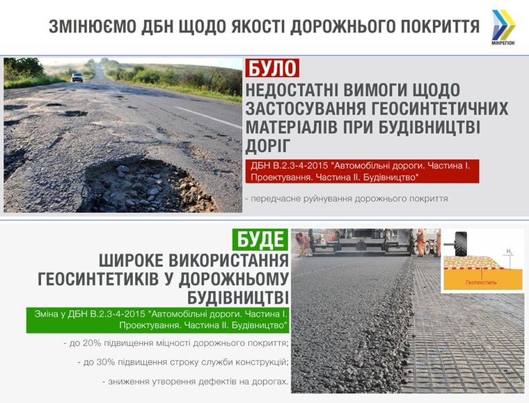 Міністерство регіонального розвитку, будівництва та ЖКГ пропонує внести зміни до державних будівельних норм щодо будівництва доріг, дозволивши використовувати геосинтетичні матеріали. Про це представники відомства повідомляють у Фейсбуці.