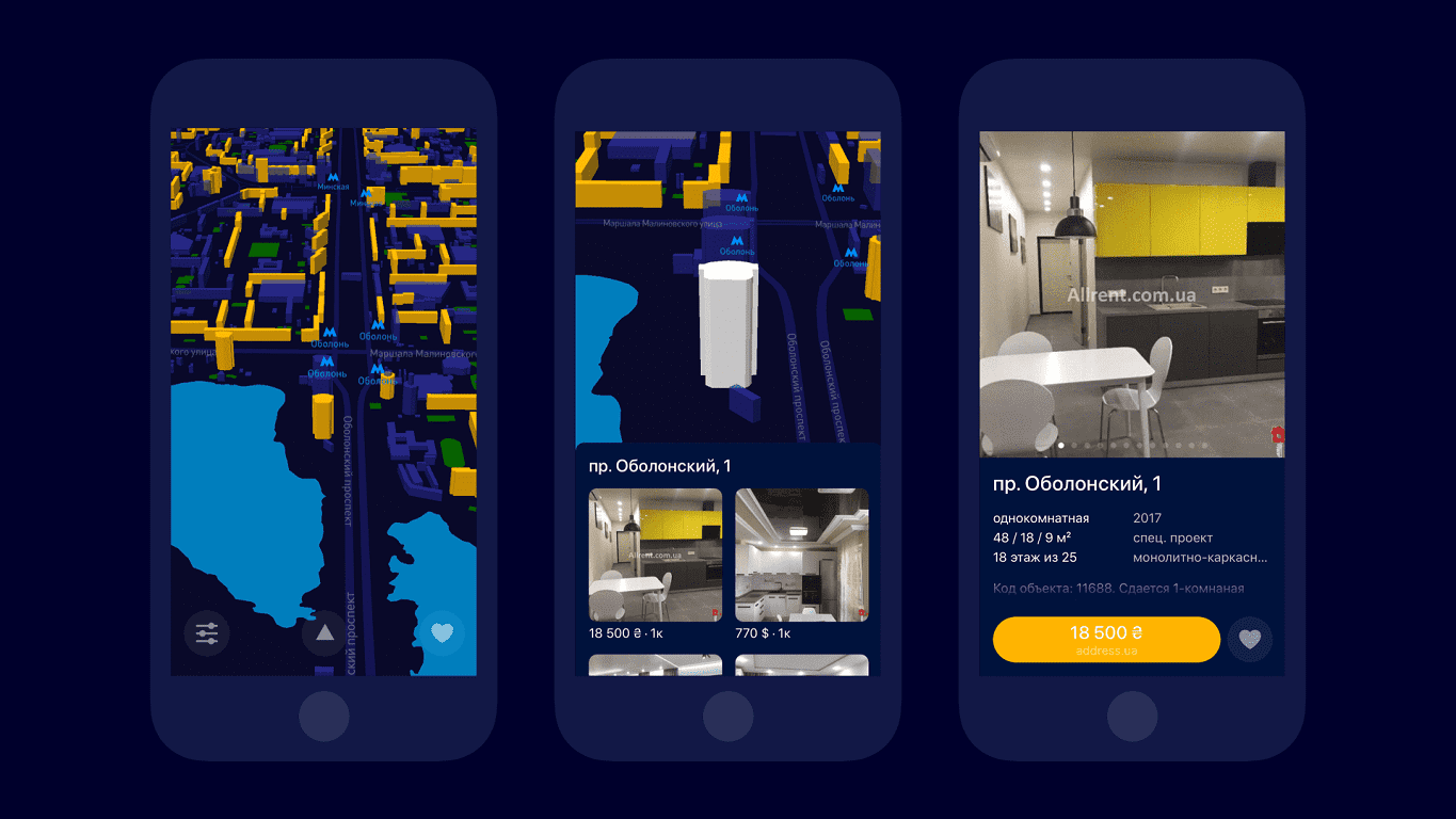 Мобільний застосунок показує всі квартири, які можна орендувати у Києві, на наочній 3D-мапі.