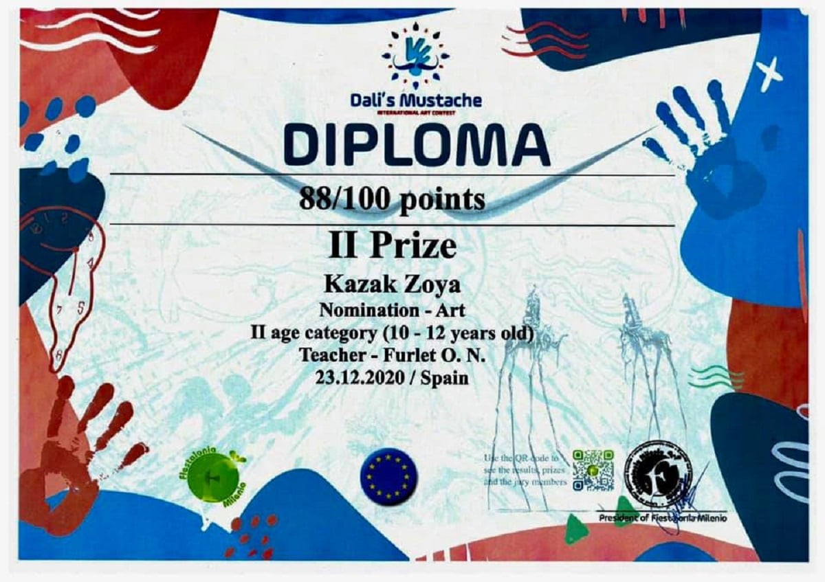 Українська школярка Зоя Казак здобула нагороду на міжнародному конкурсі образотворчого та декоративно-вжиткового мистецтва, дизайну та фотографії «Dali’s Mustache» (“Вуса Далі”), що відбувся в Іспанії.
