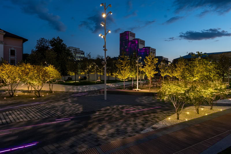 Він зазначив, що структура площі нагадує переплетення ниток, і для розкриття цієї ідеї використали рішення зі світлом. Коли людина заходить на площу, датчики руху активують світло, яке супроводжує її та реагує на кожен крок. Микола Каблука пояснив, що це символізує взаємодію людини з містом та її вплив на простір.