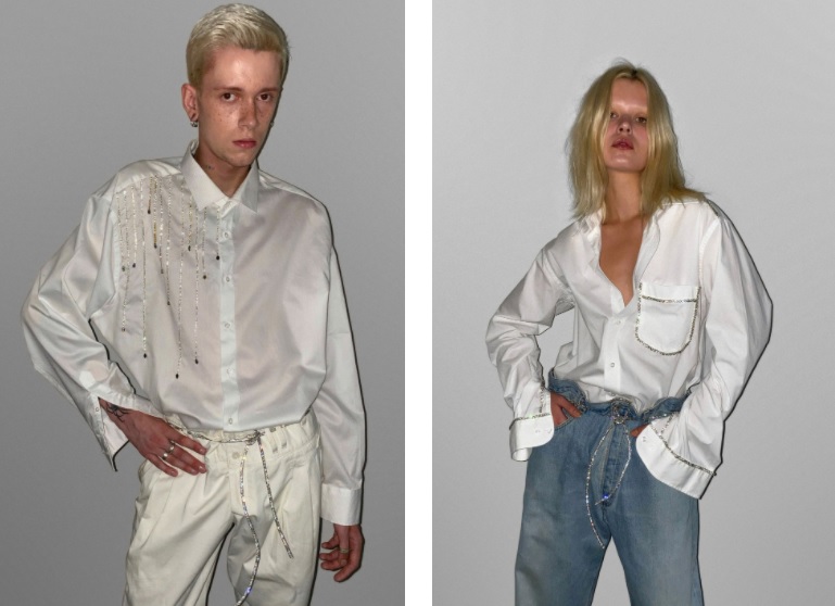 Як пише видання, дизайнер створює чоловічі сорочки з перероблених матеріалів, прикрашаючи їх стразами та кристалами.