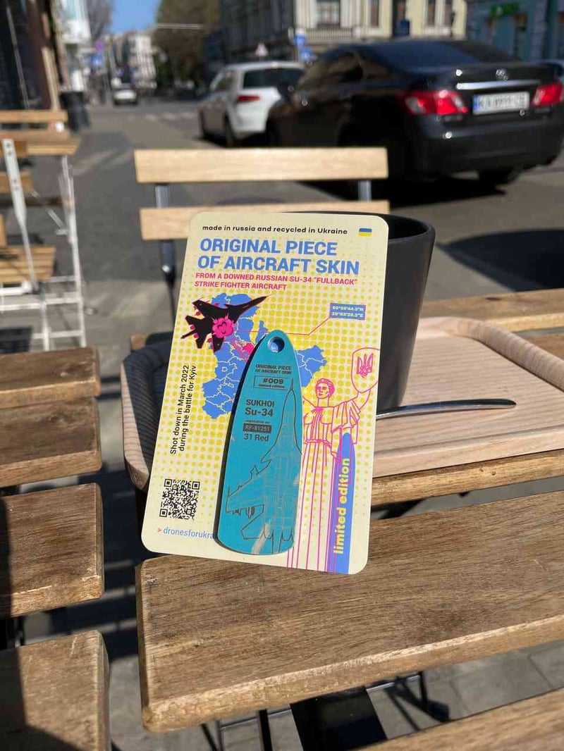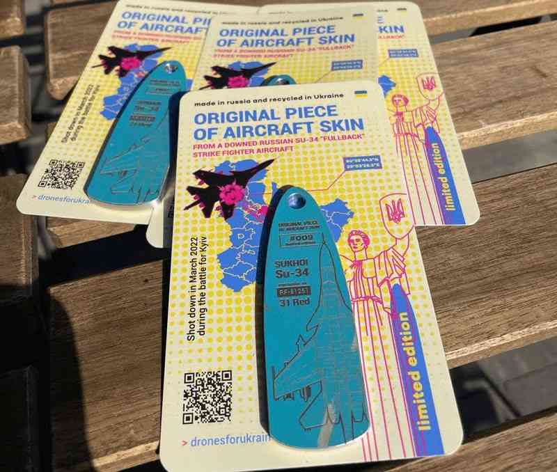 Керівник української діджитал-агенції UAMASTER Юрій Висовень виготовляє брелоки з уламків збитого ворожого літака, а зароблені гроші передає волонтерській ініціативі Drons for Ukraine.