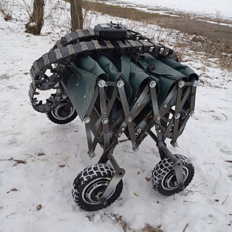 Зазначається, що система повного приводу дає змогу їздити як на колісному ходу, так і на гусеничному. Платформа захищена від бруду й легко рухається важким бездоріжжям. Дистанція керування — від 700 метрів, а запас ходу — до 10 км.