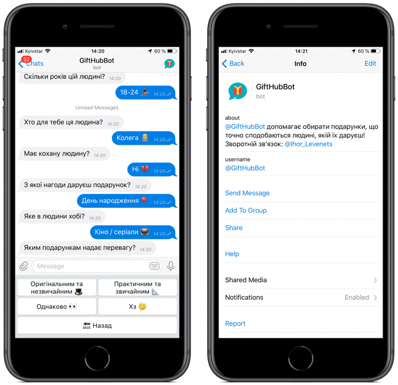 Спочатку GiftHub запустили локально, на український ринок, у вигляді Telegram-бота. Він простіший: замість автоматичного аналізу Instagram-акаунтів, потрібно вибирати подарунок в діалозі. Наприклад, сказати, кому збираєшся дарувати і які у людини хобі.