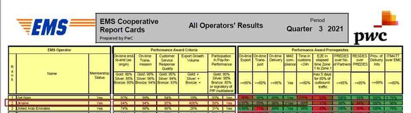 Зазначається, що за допомогою міністерства інфраструктури Укрпошта здобула право на доставку EMS (Express Mail Service) у квітні 2020 року. Тоді Україна посідала 181-ше місце у рейтингу PwC.