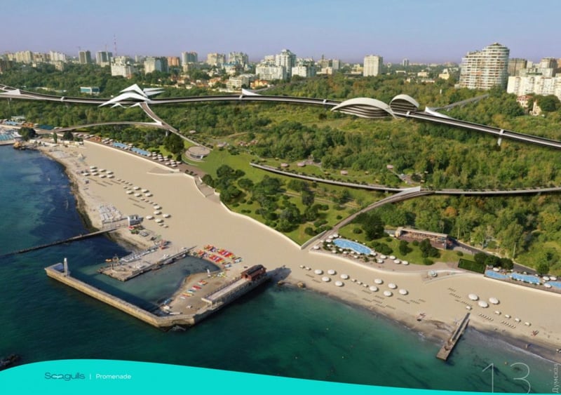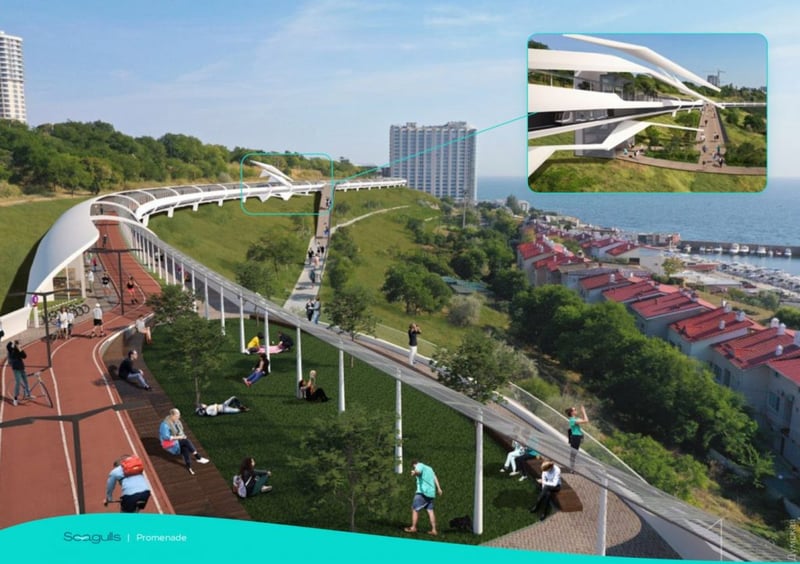 Місто з естакадою будуть з’єднувати тридцять мостів. Крім того, в проєкті є спуски на узбережжя. В окремих місцях побудують ліфти. Траса здоров’я органічно доповнює цей амбітний проєкт.
