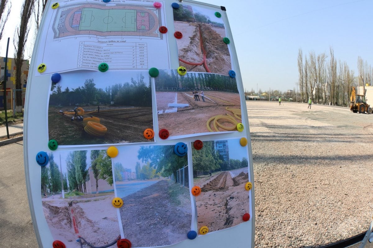 На сьогодні тут завершені підготовчі роботи: облаштована дренажна система з водовідведенням, встановлені опори під зовнішнє освітлення та огорожу. Також заасфальтовані бігові доріжки, підготовлені майданчики для баскетболу / волейболу і тенісного корту.