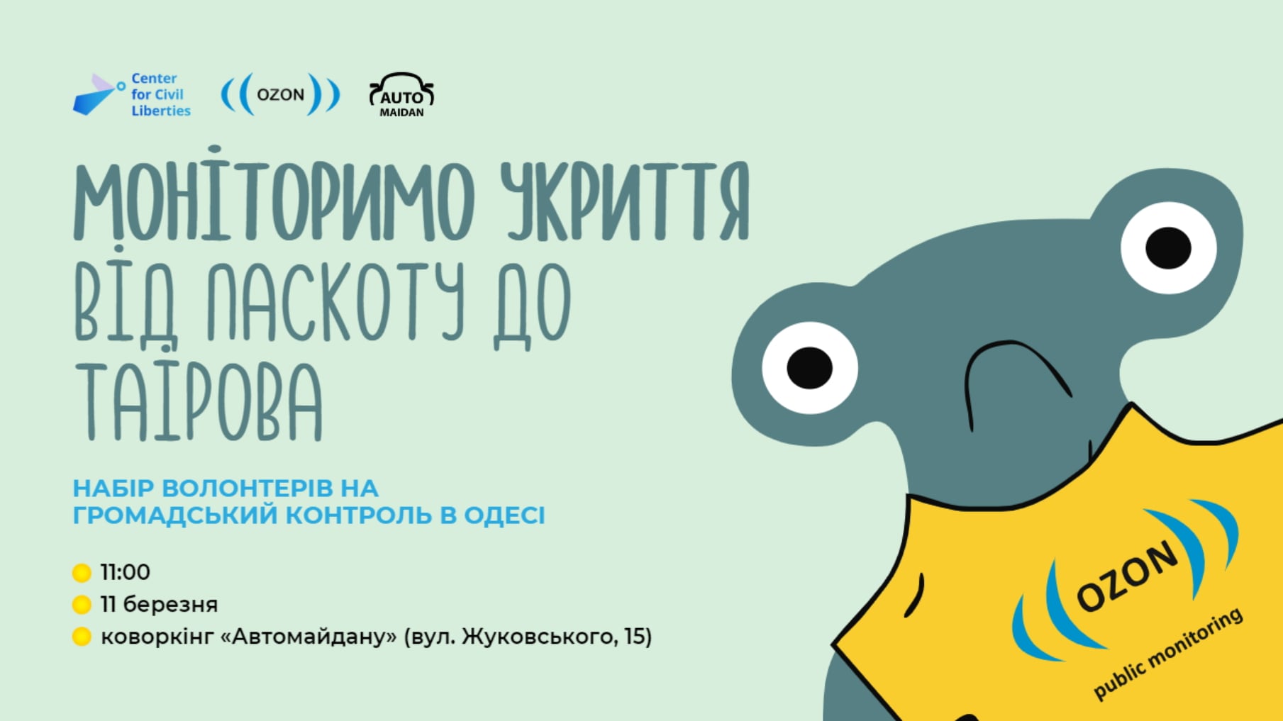 Аби сформувати команду моніторів та моніторок, які перевірятимуть укриття, в Одесі проведуть спеціальне навчання. Воно відбудеться 11 березня об 11:00 у коворкінгу «Автомайдану» (вул. Жуковського, 15).