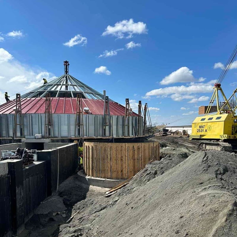 Наразі розпочато монтажні роботи зі встановлення перших двох силосів діаметром 22 метри. На черзі зерносушарка У13-СШ50М2Т та транспортне обладнання продуктивністю 100 тонн на годину.