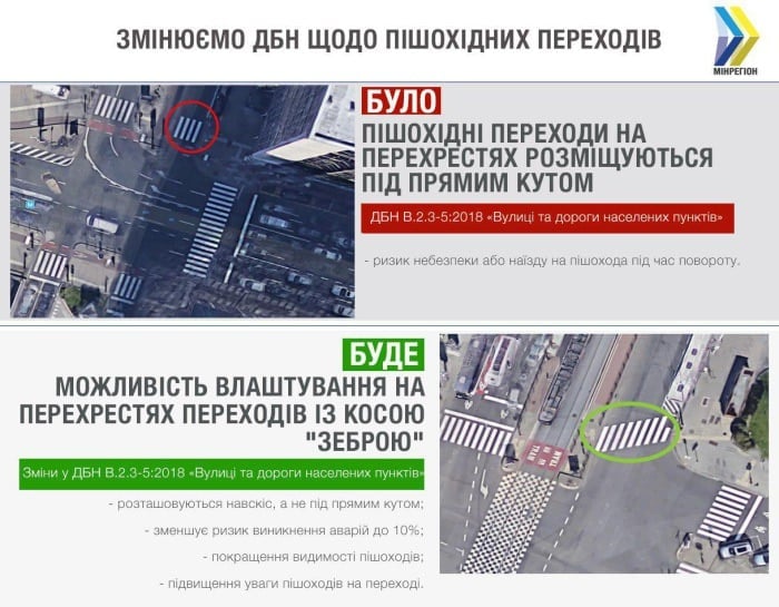 Мінрегіон розглядає зарубіжний досвід “косої зебри” – вона розміщується не під прямим кутом до тротуару, як зазвичай, а навскіс.