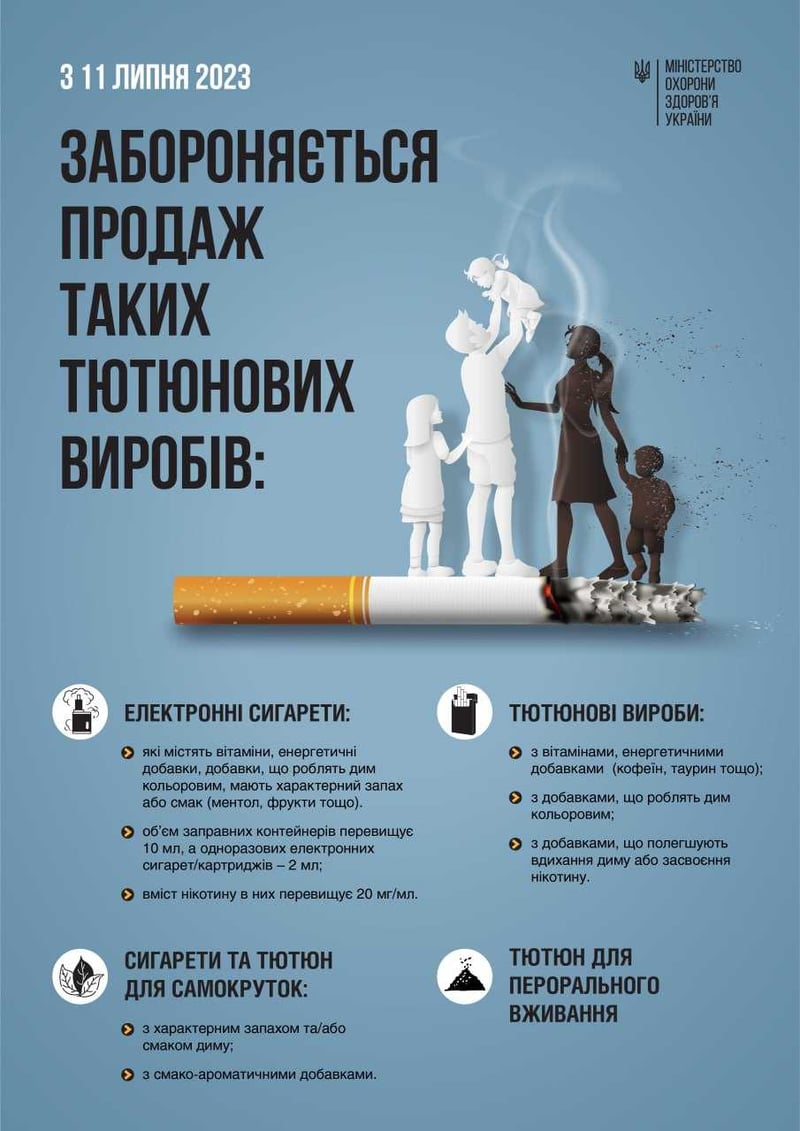 «Заборона виробництва та продажу тютюнових виробів, е-сигарет та рідин до них з добавками набуває чинності з 11 липня. Проте залишки продукції виробники зможуть розпродавати ще протягом року», — йдеться у повідомленні.