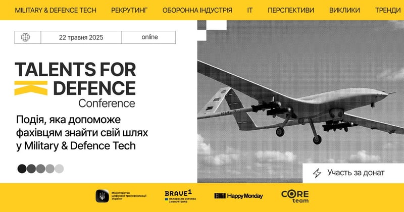 22 травня з 10:00 до 16:00 відбудеться Talents for Defence Conference для тих, хто бачить себе у сфері створення оборонних технологій. Українські Defence Tech-компанії щомісяця відкривають десятки нових вакансій для розробників, маркетологів, менеджерів та інших фахівців.