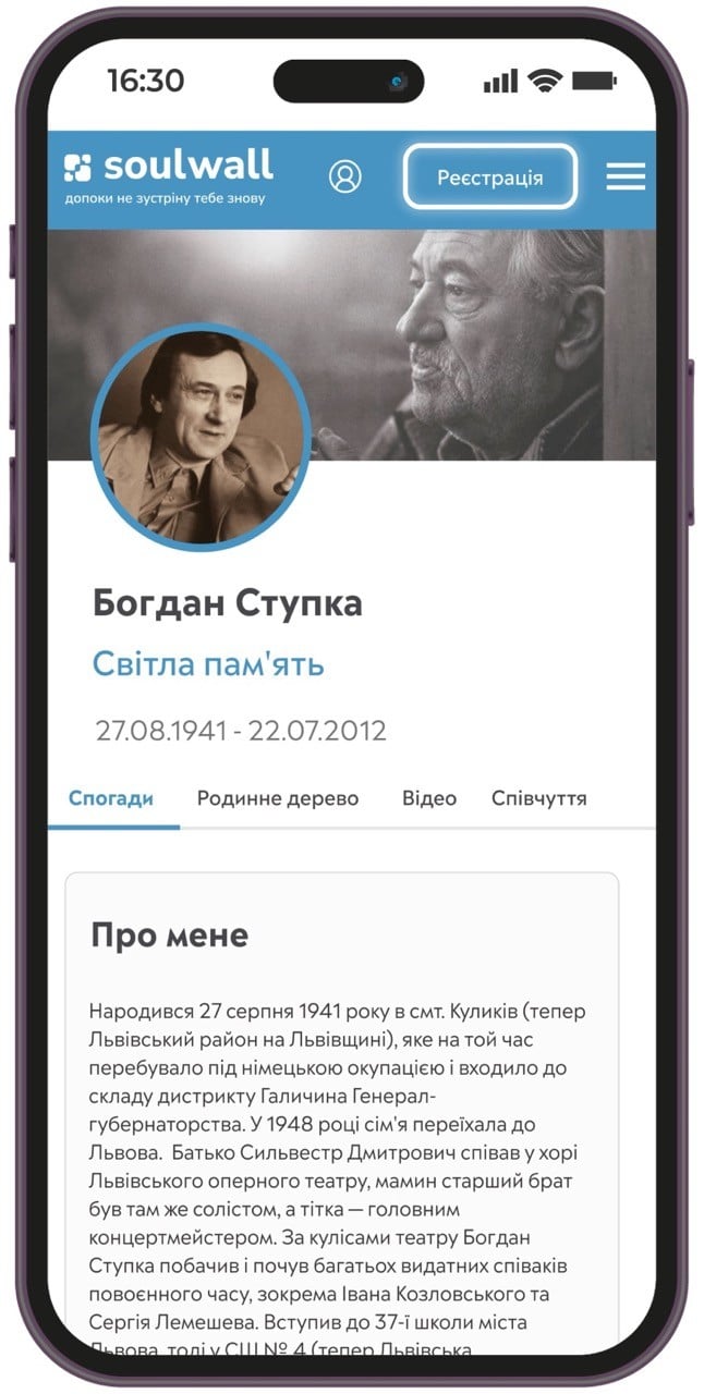 - «Додавання інформації» — на сторінках можна зберігати біографію, фото та відео, створюючи цифровий архів спогадів.
