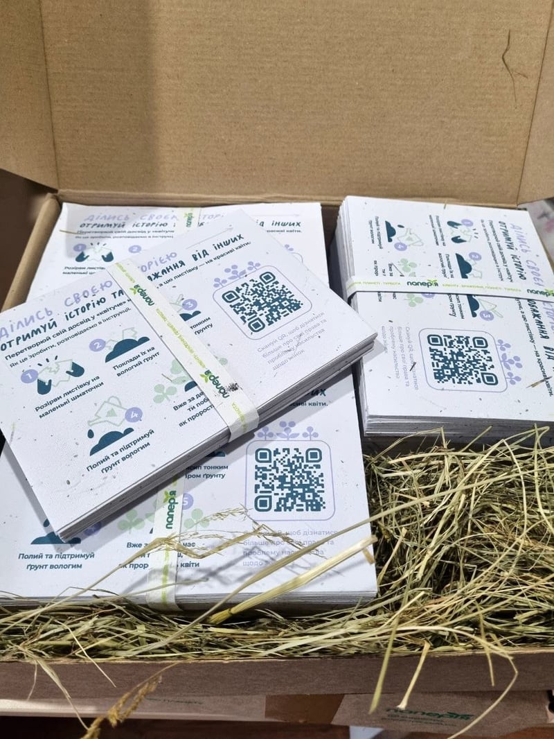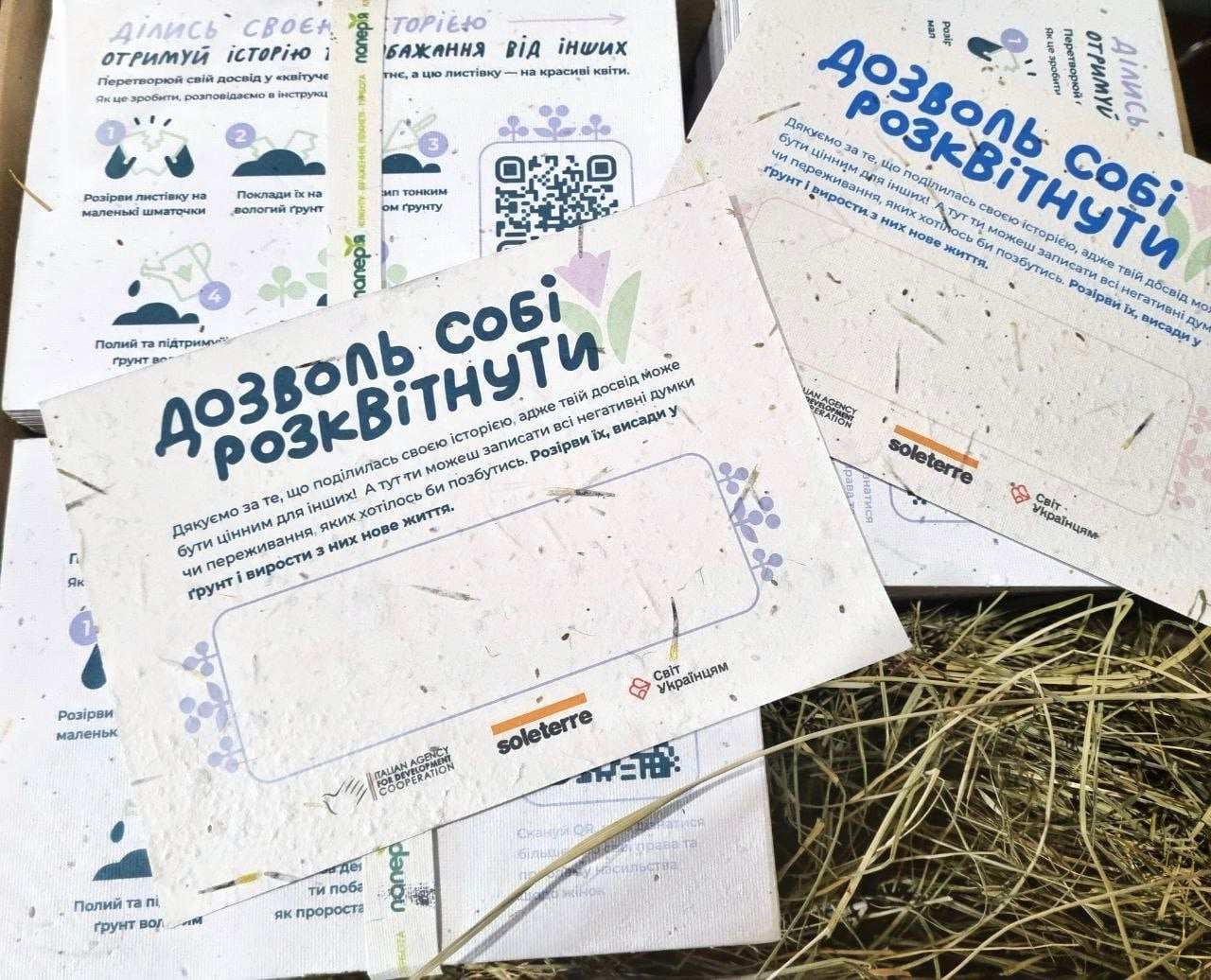 Листівки випустив благодійний фонд «Світ Українцям» у межах проєкту «Фрезія». Жінки, які пережили гендерно зумовлене насильство (ГЗН), можуть розповісти власну історію й отримати листівки з насінням квітів.