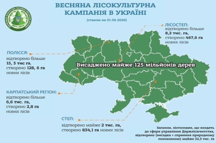 Навесні 2020 року в Україні висадили 125 млн дерев. Про це повідомляється на сайті Державного агентства лісових ресурсів України.
