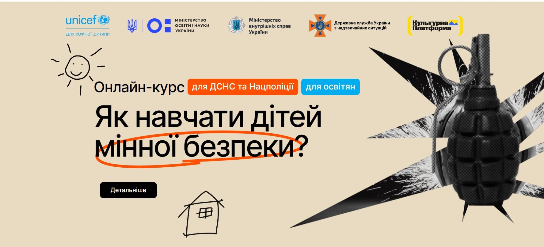 «Онлайн-курс пропонує його слухачам комплексний план занять із дітьми й підлітками щодо поводження з вибухонебезпечними предметами та базується на міжнародних стандартах. Він надає викладачам практичні інструменти для формування безпечної поведінки на територіях, потенційно забруднених мінами та іншими вибухонебезпечними предметами. ЮНІСЕФ залучив до співпраці фахівців у сфері дитячої та вікової психології, педагогіки, інклюзивної освіти, мінної просвіти й поведінкових змін, щоб допомогти учасникам курсу стати ефективними провідниками безпеки для дітей і молоді», — розповіли в МОН.