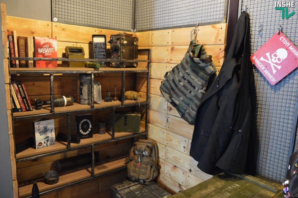 Крім того вистачає армійського і в антуражі закладу: бронежилет, ящики від патронів, рештки снарядів та книжками про війну на Донбасі.
