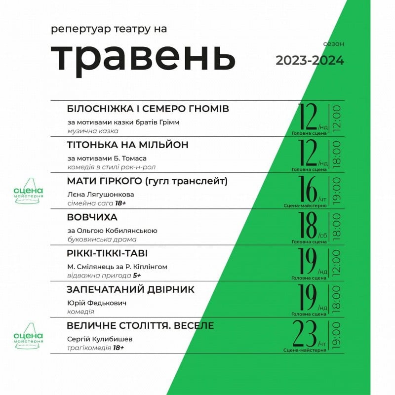 У Чернівецькому обласному музично-драматичному театрі імені Ольги Кобилянської представили репертуарну афішу на травень. Вистави відбуватимуться на великій сцені і сцені-майстерні.
