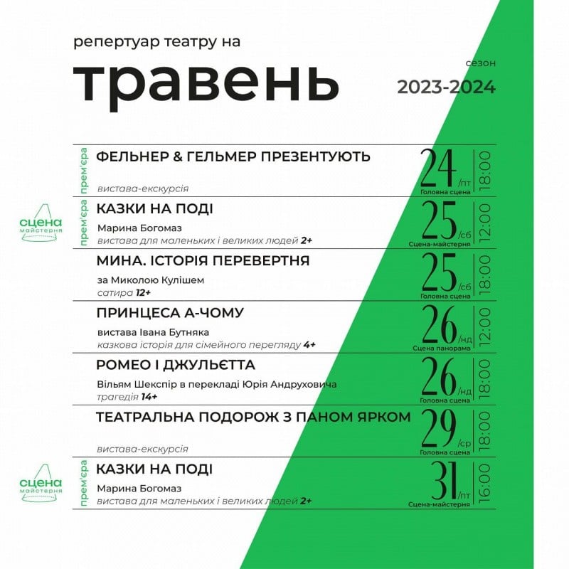 Глядачі зможуть побачити як добре відомі “Вовчиху”, “Тітоньку на мільйон”, “Запечатаного двірника”, так і вистави, прем’єри яких відбулися нещодавно – “Казки на поді”, “Ріккі-Тіккі-Таві” та інше. Крім того, 7,9 та 24 травня відвідувачам представлять нову виставу-екскурсію “ФЕЛЬНЕР & ГЕЛЬМЕР ПРЕЗЕНТУЮТЬ”.