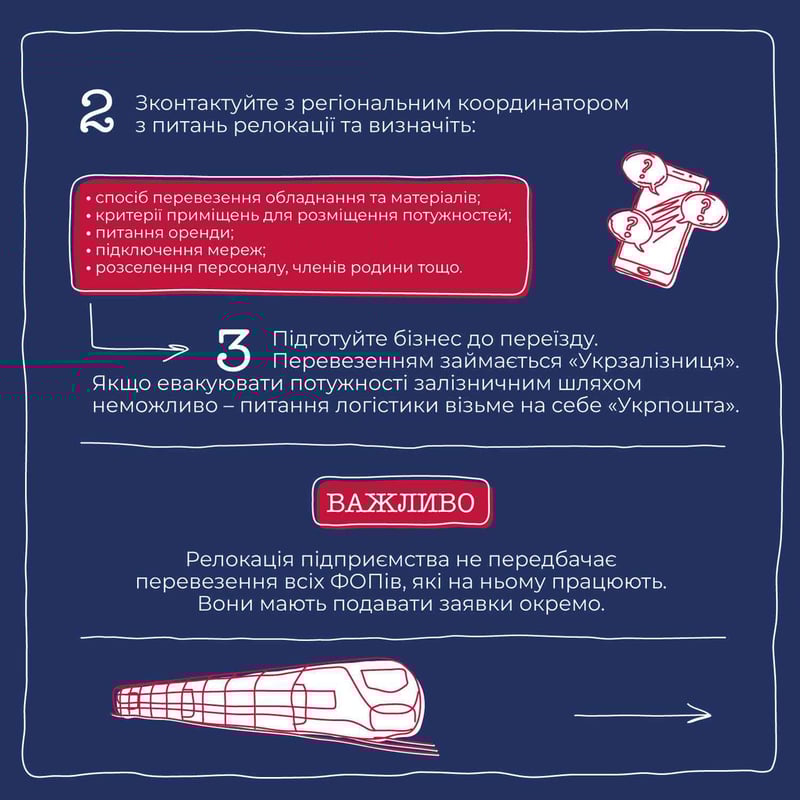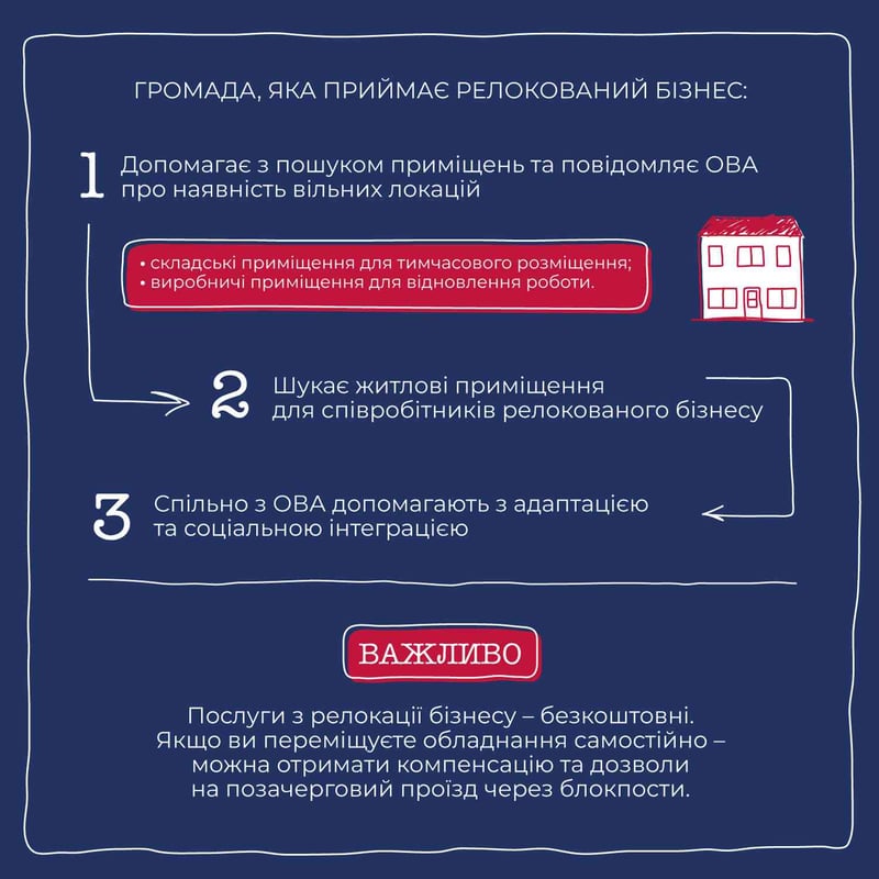 У межах проєкту «Громада Діє» команда ШоТам створила серію графічних інструкцій з порадами для громад та внутрішньо переміщених українців. Ми розповідаємо про відбудову громади, створення волонтерських хабів, залучення донорського фінансування, а цього разу підготували покрокову інструкцію, яка допоможе під час релокейту вашого підприємства.