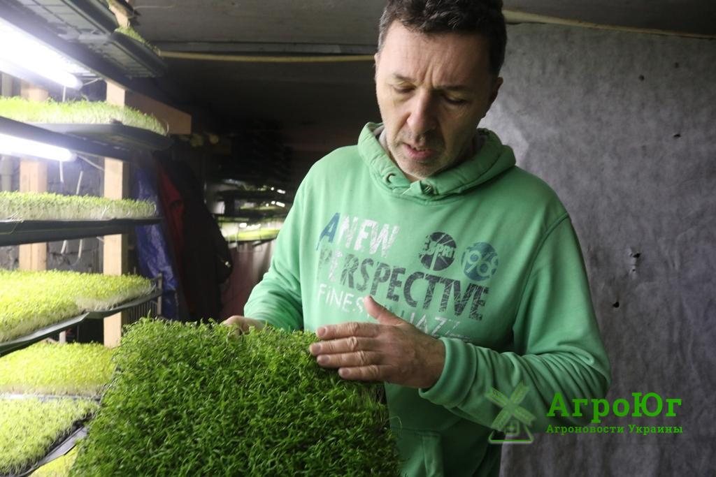 Фермер з Миколаєва Руслав Грімов вирощує вдома 12 видів їстівних паростків рослин. На двох поверхах заміського будинку стелажі і кілька десятків ящиків із мініатюрною зеленню моркви, ячменю, крес-салату, кукурудзи, соняшника, люцерни, редису і гороху.