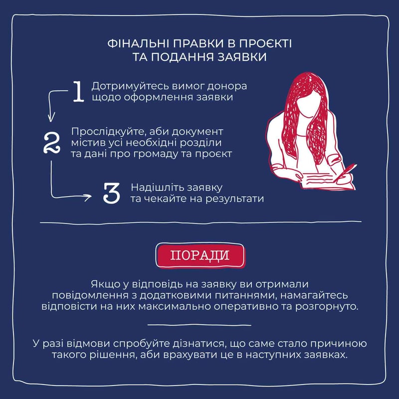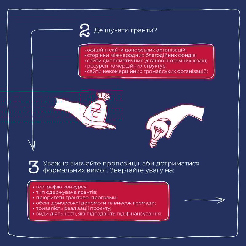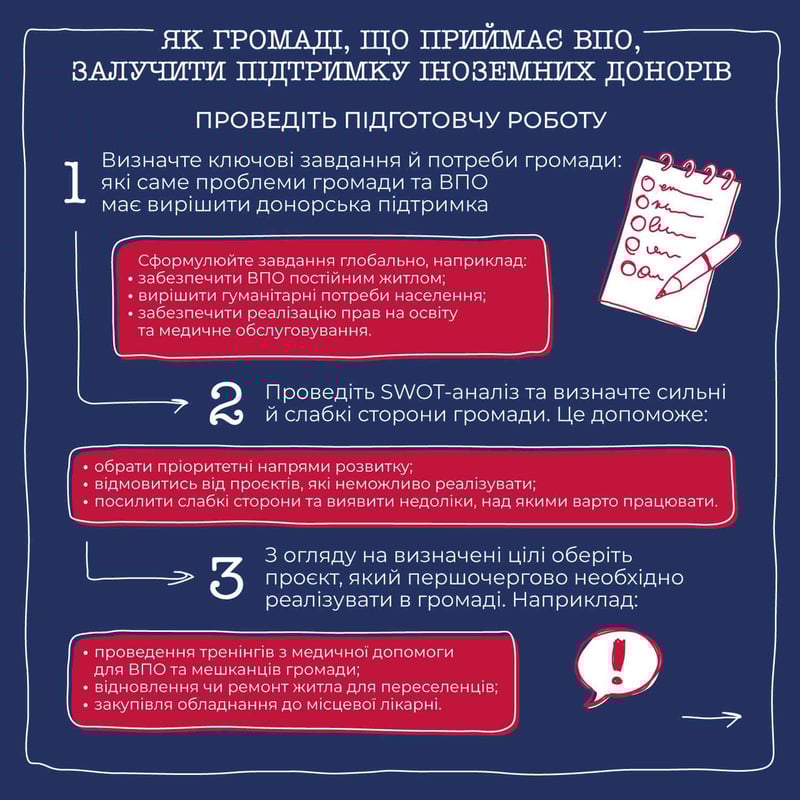 Як громаді, що приймає переселенців, залучити підтримку донорів? Усе просто: визначте пріоритетний проєкт, проведіть попередні підрахунки й знайдіть грантодавця, який відповідає вашим запитам. Звучить складно? Пояснюємо простою мовою в новій інфографіці!