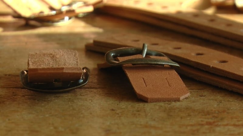 Для виготовлення постолів у Романа Лучука є попередньо заготовлені деталі. Усе потрібне чоловік зшиває, а потім виріб затягує смужкою зі шкіри.