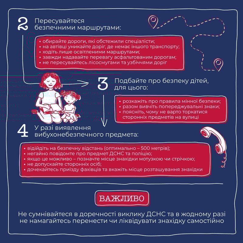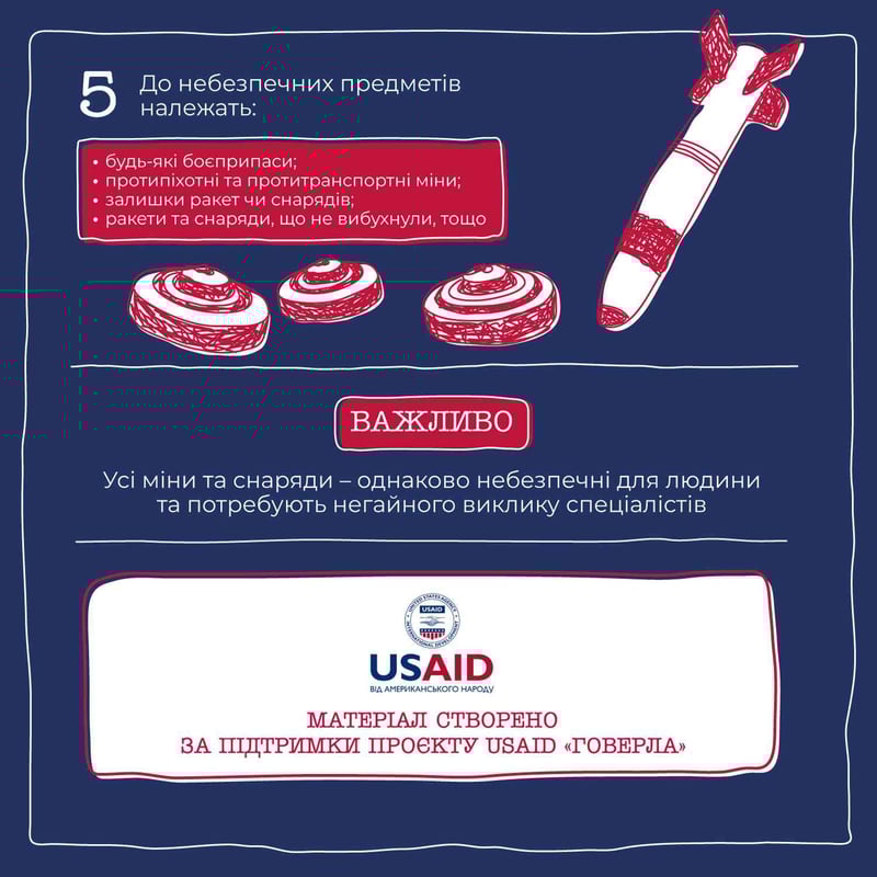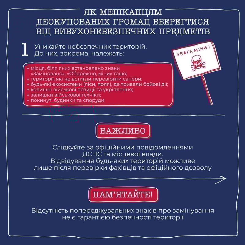 У межах проєкту «Громада Діє» команда ШоТам створила серію графічних інструкцій з порадами для громад та внутрішньо переміщених українців. Ми розповідаємо про відбудову громади, релокацію бізнесу, залучення донорського фінансування, а цього разу підготували покрокову інструкцію, яка допоможе вберегтися від мін та інших небезпечних предметів.