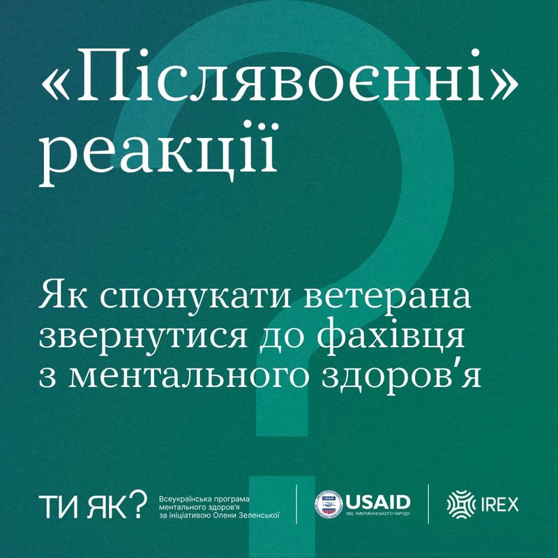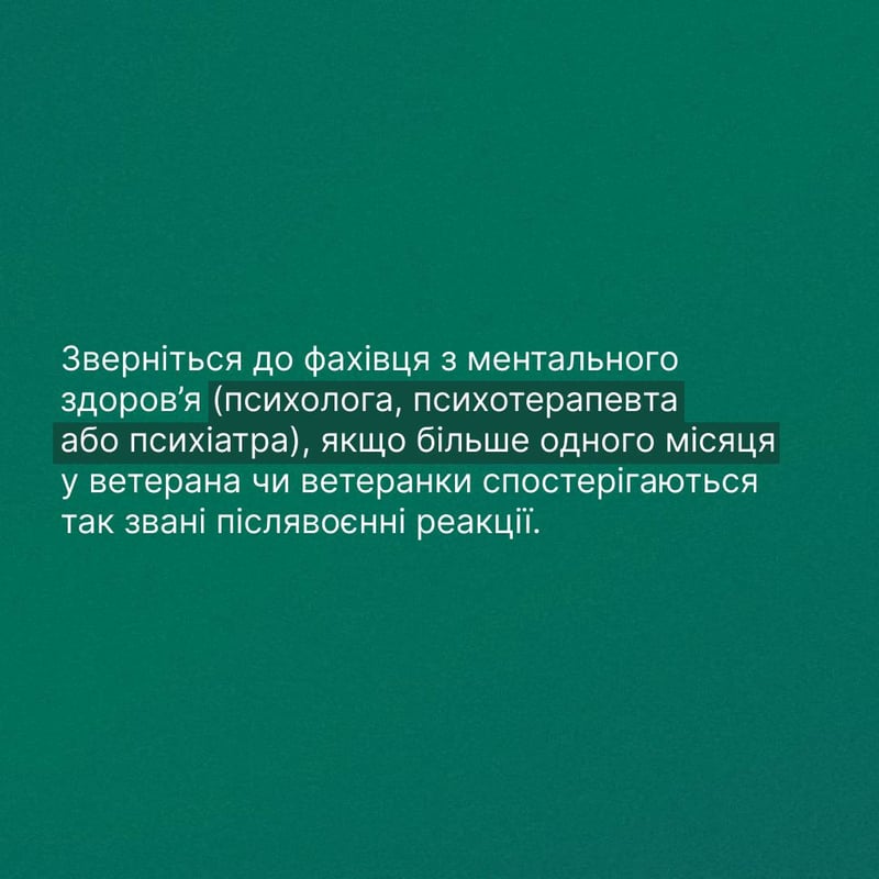 Зверніться до фахівця з ментального здоров’я (психолога, психотерапевта або психіатра), якщо більше одного місяця у ветерана чи ветеранки спостерігаються так звані післявоєнні реакції.