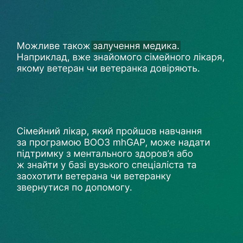 Сімейний лікар, який пройшов навчання за програмою ВО03 mhGAP, може надати підтримку з ментального здоровʼя або ж знайти у базі вузького спеціаліста та заохотити ветерана чи ветеранку звернутися по допомогу.
