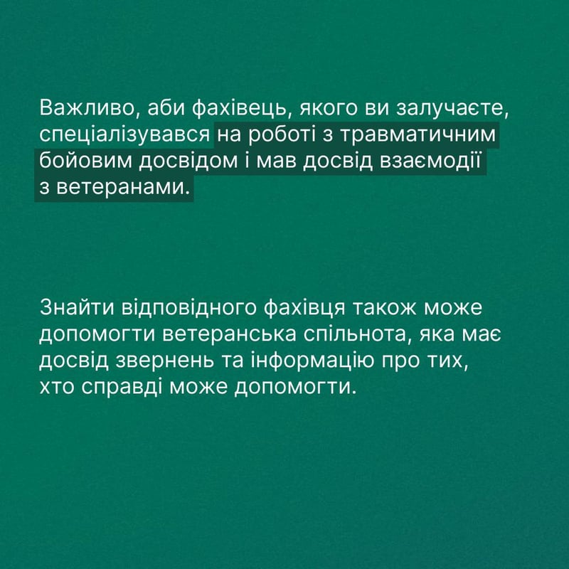 Знайти відповідного фахівця також може допомогти ветеранська спільнота, яка має досвід звернень та інформацію про тих, хто справді може допомогти.