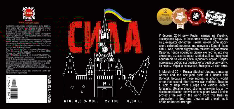 Львівська броварня “Правда” стібеться з російської міфотворчості етикетками. Зокрема, є пиво “Сила”, на якому зображений Кремль з українським прапором на верхівці. На етикетці є текст українською та англійською мовою про окупацію Криму та початок російсько-української війни у 2014 році.
