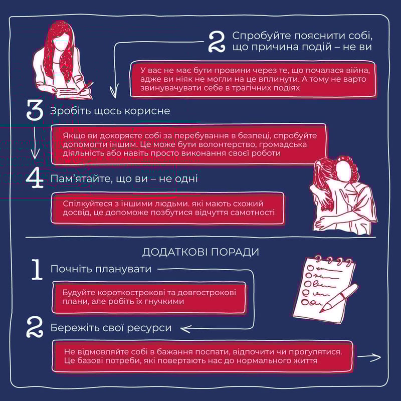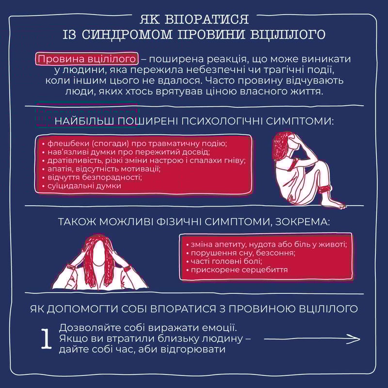 У межах проєкту «Громада Діє» команда ШоТам створила серію графічних інструкцій з порадами для громад та внутрішньо переміщених українців. Ми розповідаємо про відбудову громади, релокацію бізнесу, залучення донорського фінансування, а цього разу підготували покрокову інструкцію, яка допоможе побороти синдром провини вцілілого.