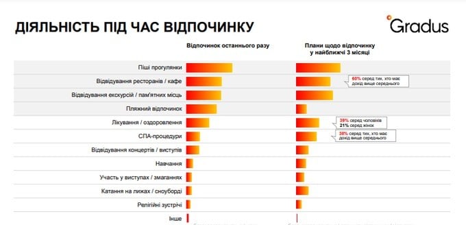 На літо 2024 року 80% опитаних українців планують відпустку. Більшість обирають відпочинок з партнером або сім’єю. Респонденти віддають перевагу сімейним готелям, апартаментам та котеджам в лісі або біля гір. Найпопулярніші активності на відпочинку – піші прогулянки, відвідування ресторанів, екскурсії та огляд пам’ятних місць.