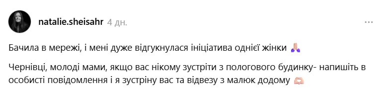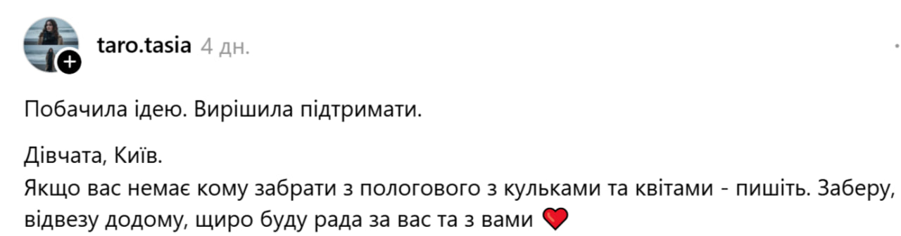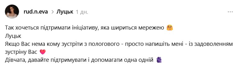 «Пишіть, не соромтеся — життя буває таким різним, але ми є одне в одного. У такі моменти я підтримаю і матусю, і малюка. Приїду, зустріну, обійму, відвезу додому. Я сама жінка і знаю, як це важливо кожній із нас. Разом ми сила»,