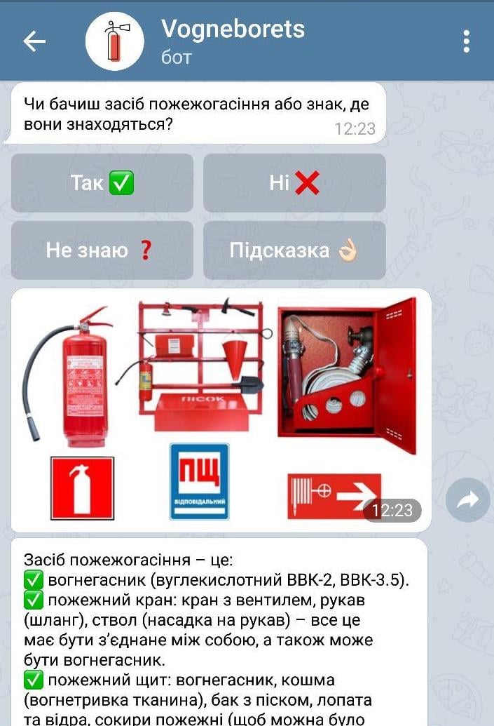 Також завдяки боту можна дізнатися про основні параметри пожежної безпеки: пожежні гідранти, решітки на вікнах, аварійні виходи. Так можна відчути себе інспектором і зрозуміти, наскільки безпечне те місце, де ви зараз перебуваєте. Адже краще вберегтися від пожежі, ніж від неї рятуватися.