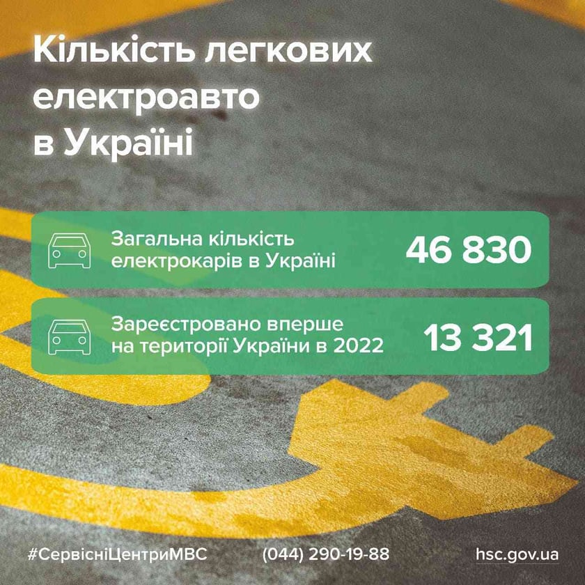 За інформацією, станом на 1 січня 2023 року загальна кількість електромобілів зареєстрованих в Україні становить 46 830.