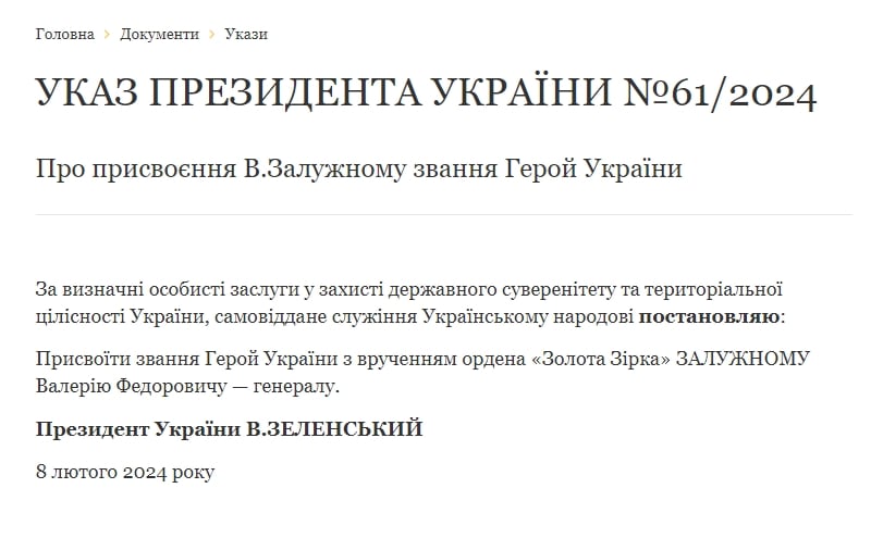 «За визначні особисті заслуги у захисті державного суверенітету та територіальної цілісності України, самовіддане служіння Українському народові постановляю: присвоїти звання Герой України з врученням ордена «Золота Зірка» Залужному Валерію Федоровичу — генералу», — йдеться в указі.